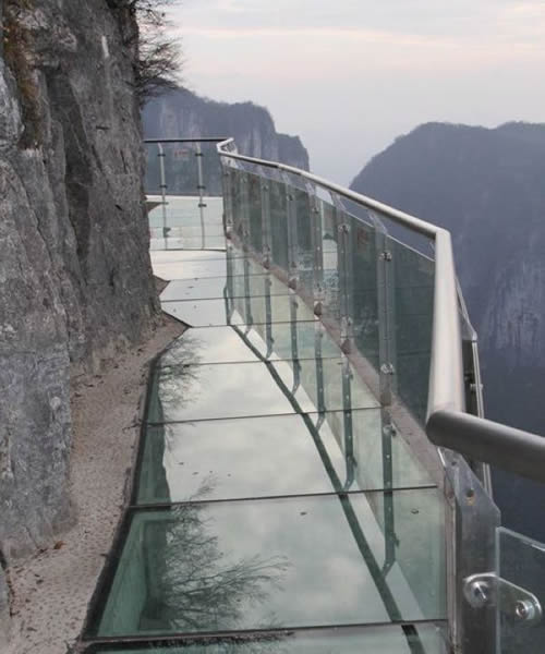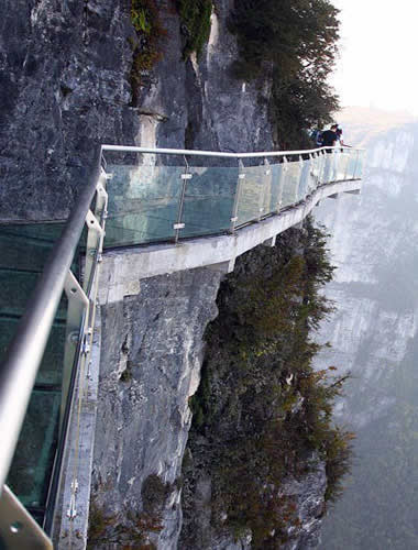 | 2011年10月1日,张家界天门山国家森林公园新建的玻璃栈道正式对游客开放。玻璃栈道悬于天门山顶西线,长60米,最高处海拔1430米。是张家界天门山景区继悬于峭壁之上的鬼谷栈道、凭空伸出的玻璃眺望台、从玻璃台可以看见下面。玻璃台伸出栈道有4-5米,专供游人拍照、横跨峡谷的木质吊桥后打造的又一试胆力作。为了让游客零瑕疵的透过玻璃桥看到美丽的风景,上桥的游客均要求戴上鞋套,以保持玻璃桥的透明和干净。玻璃栈道的刺激震撼,可与举世闻名的美国大峡谷玻璃走廊“天空之路”媲美,因而有了东方“天空之路”的美誉。